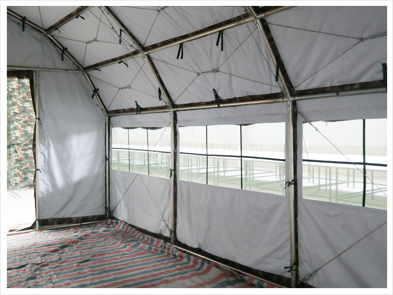 該帳篷結(jié)構(gòu)合理、空間開(kāi)闊、安全可靠。穩(wěn)定性能優(yōu)良,抗風(fēng)承載、抗雪承載能力強(qiáng)。采用套管式通頭、彈簧插銷(xiāo)連接,互換性強(qiáng),無(wú)需任何組裝工具即可安裝替換。篷布采用滌綸草綠(林地?cái)?shù)碼)防水帆布,里布采用本白牛津布。其在抗拉、抗撕裂、耐老化、防雨等方面性能優(yōu)良。